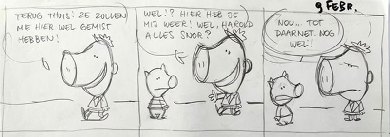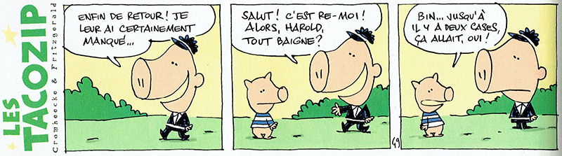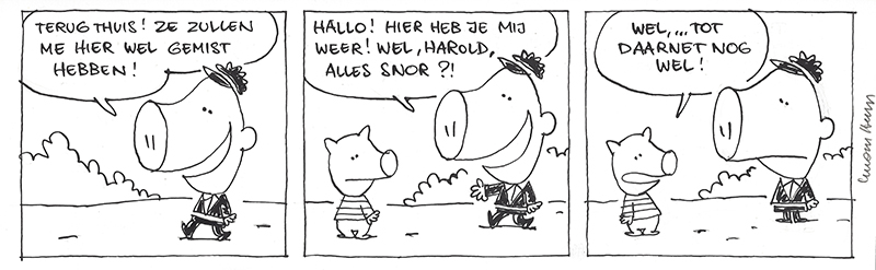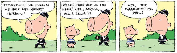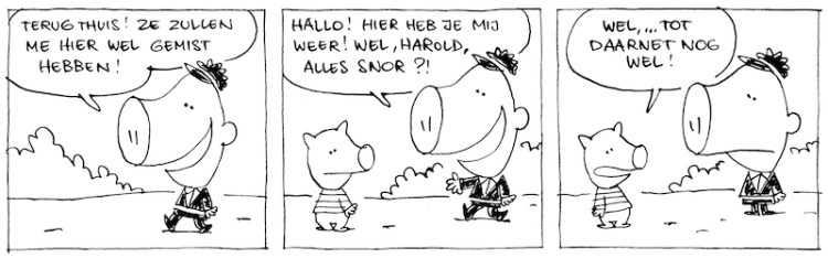 In het Frans lijkt er wel een extra grapje te zijn (Harold weet dat ie in een strip zit!). 🙂
